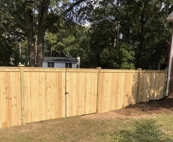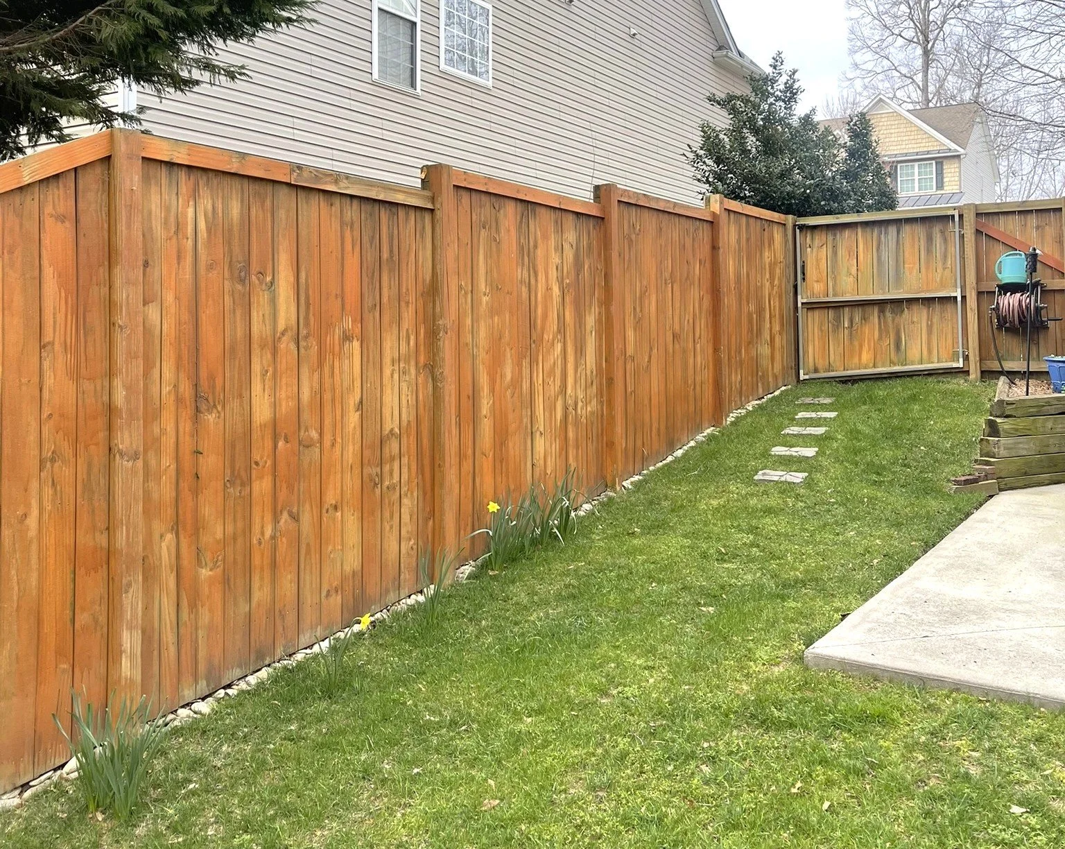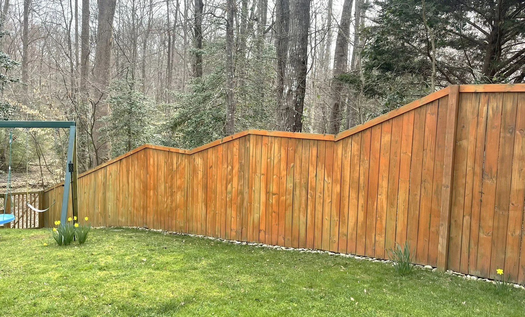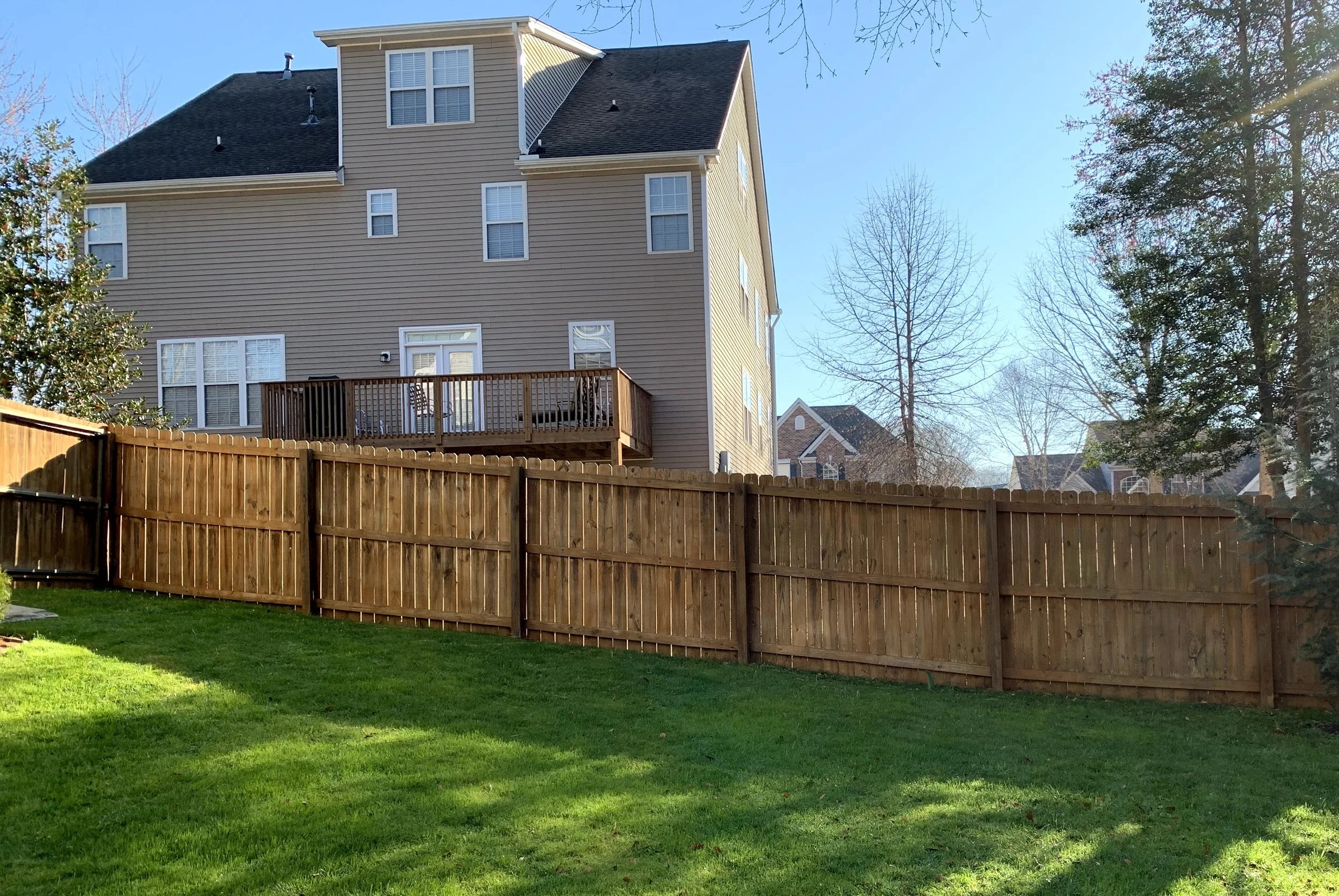 Suburban backyard with wooden fence, green lawn, and beige house with deck on a clear day.