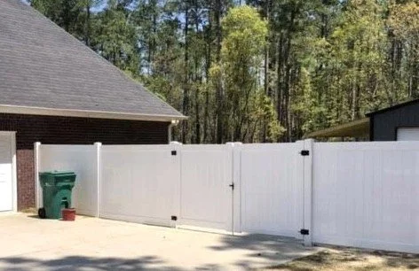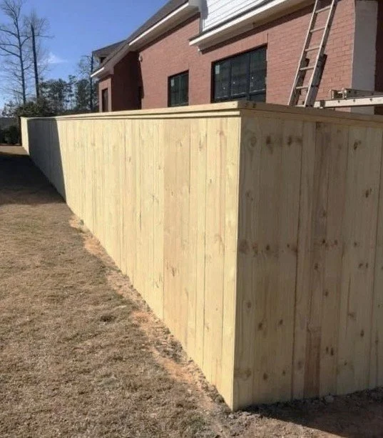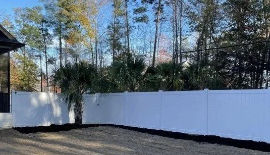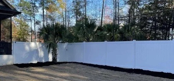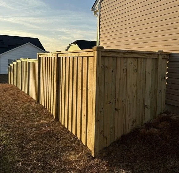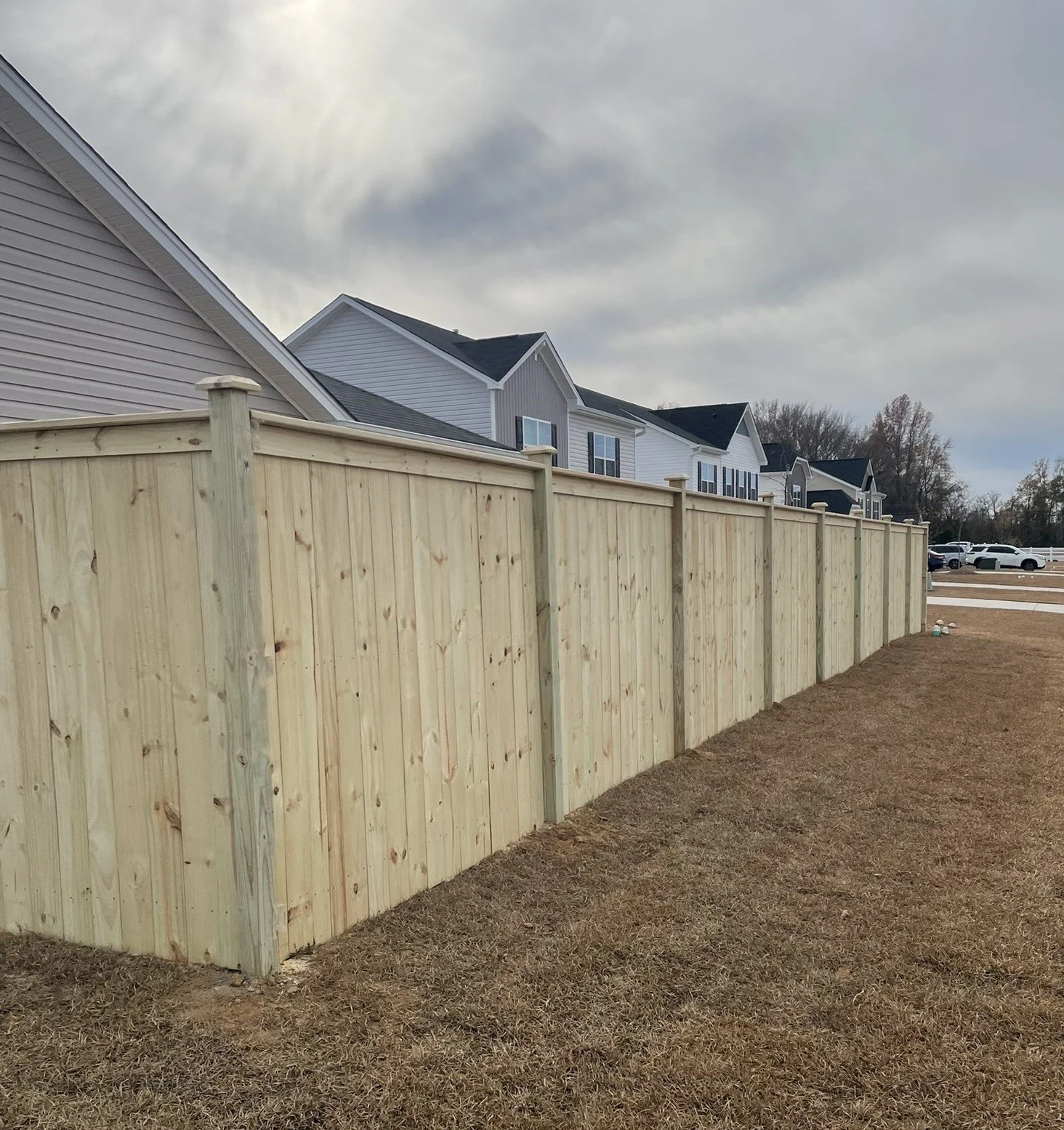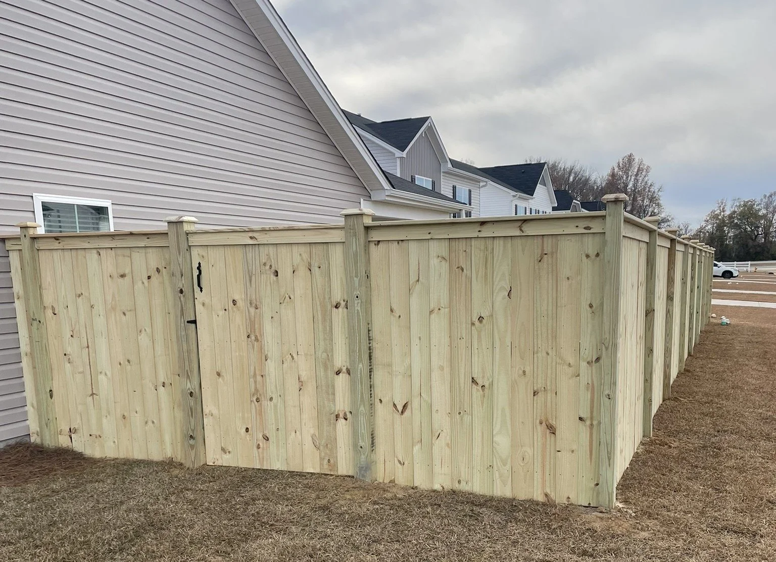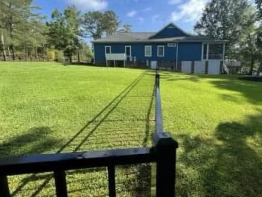 Suburban backyard with wooden fence, green lawn, and beige house with deck on a clear day.