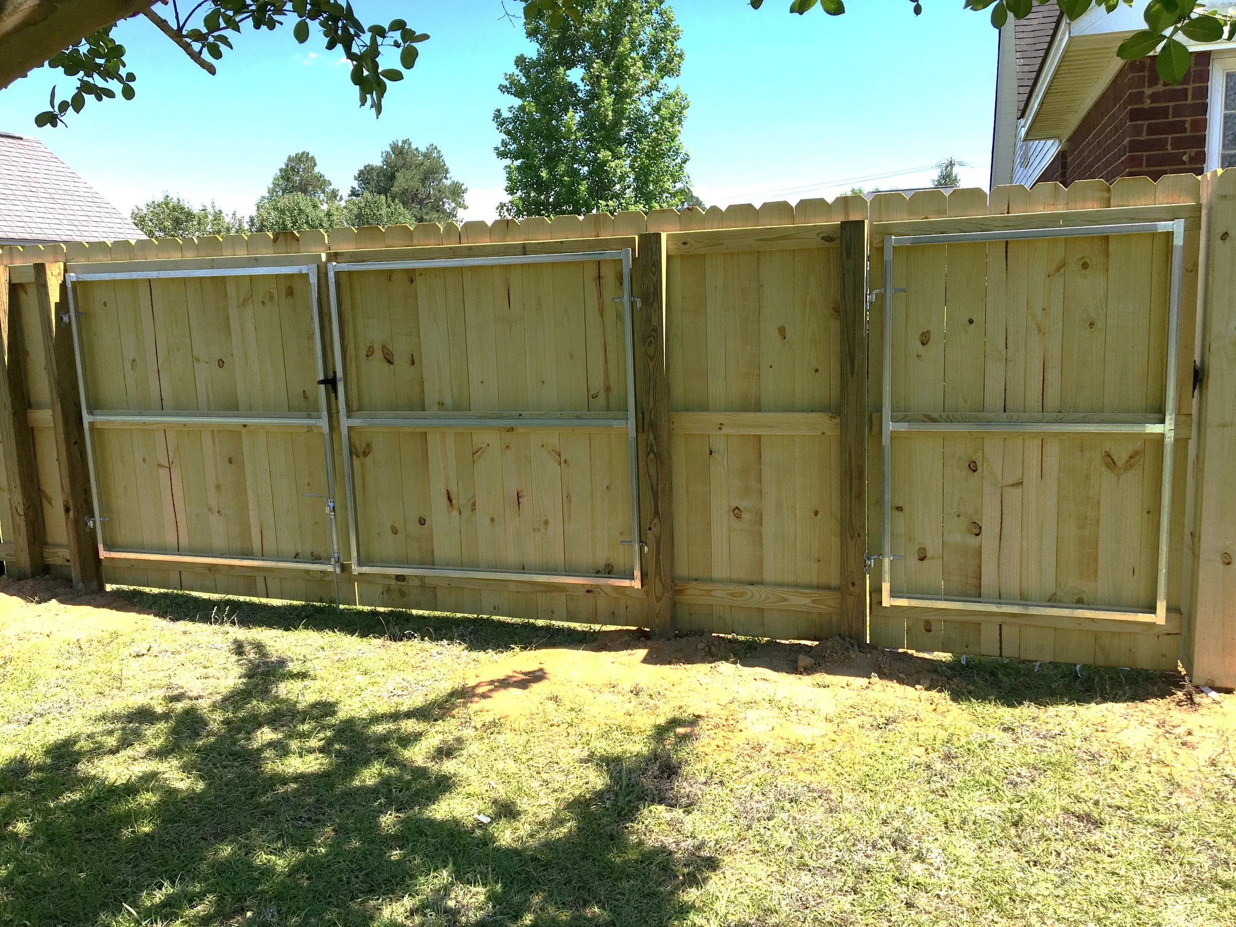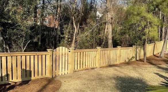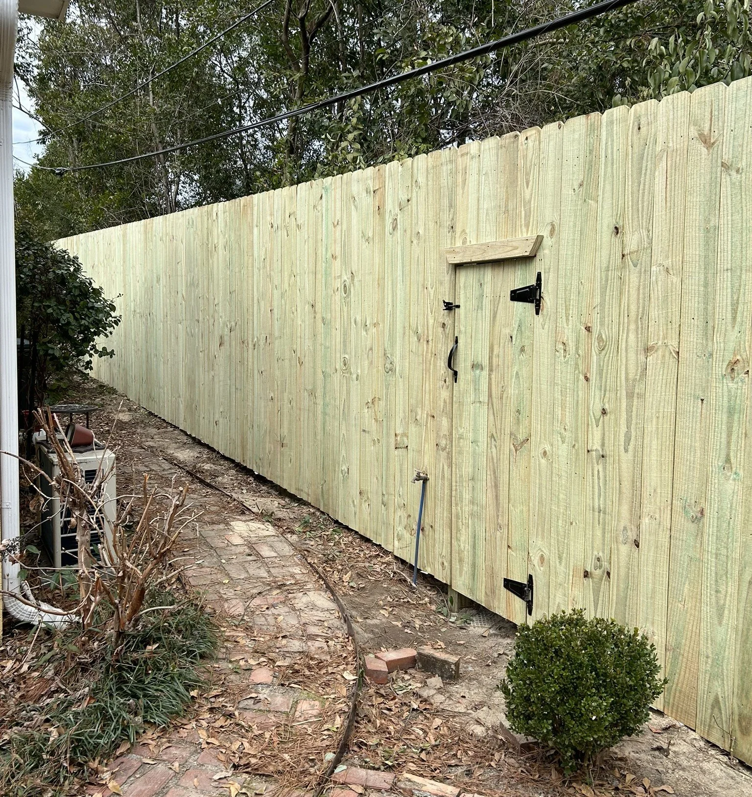 Wooden privacy fence with gate and latch in a backyard garden with brick path and greenery.