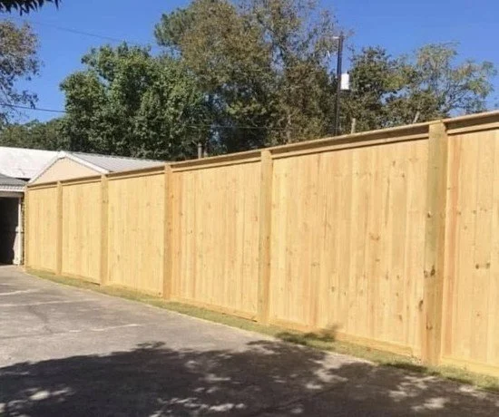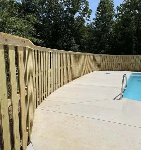 Wooden fence surrounding an above-ground pool with a concrete deck.