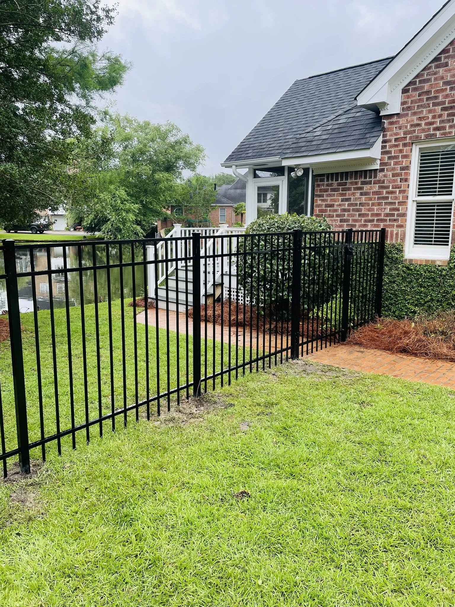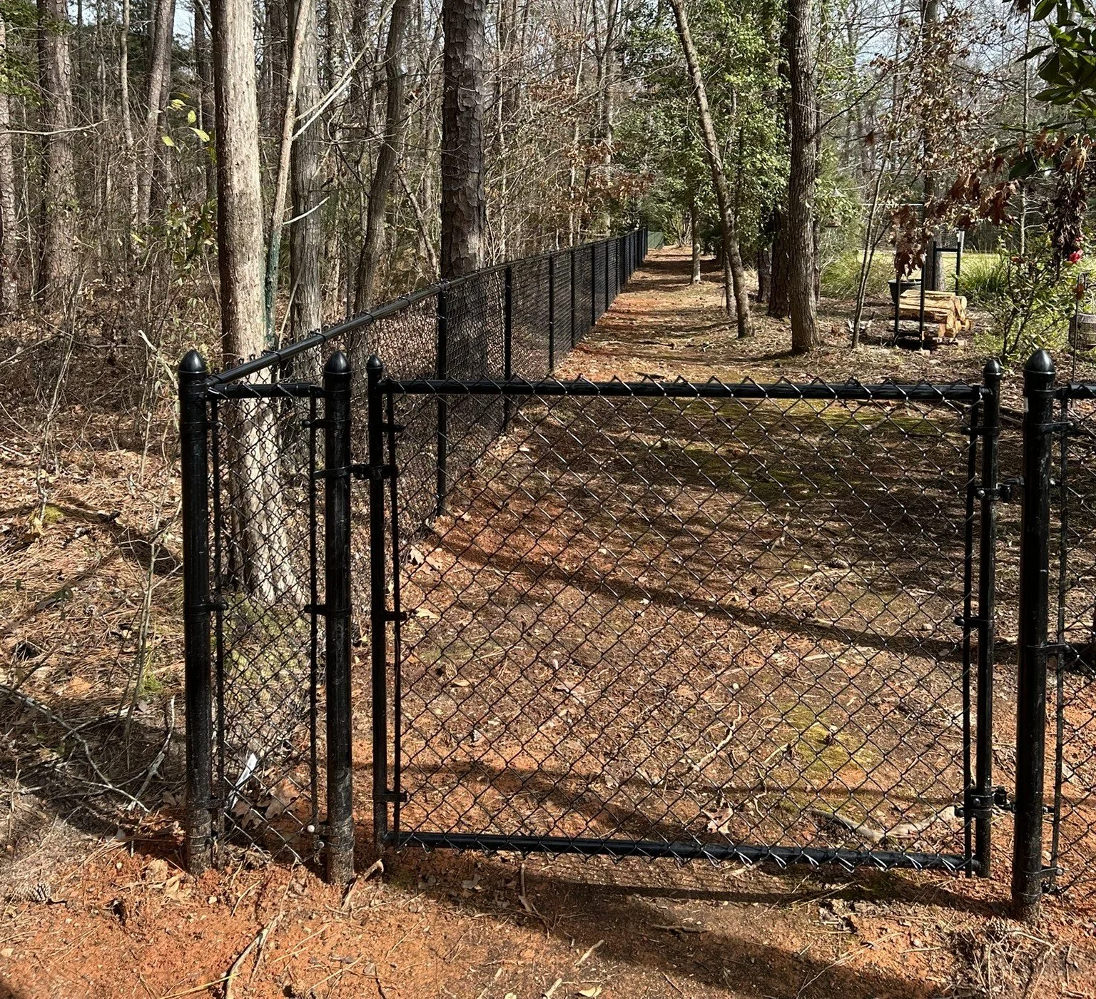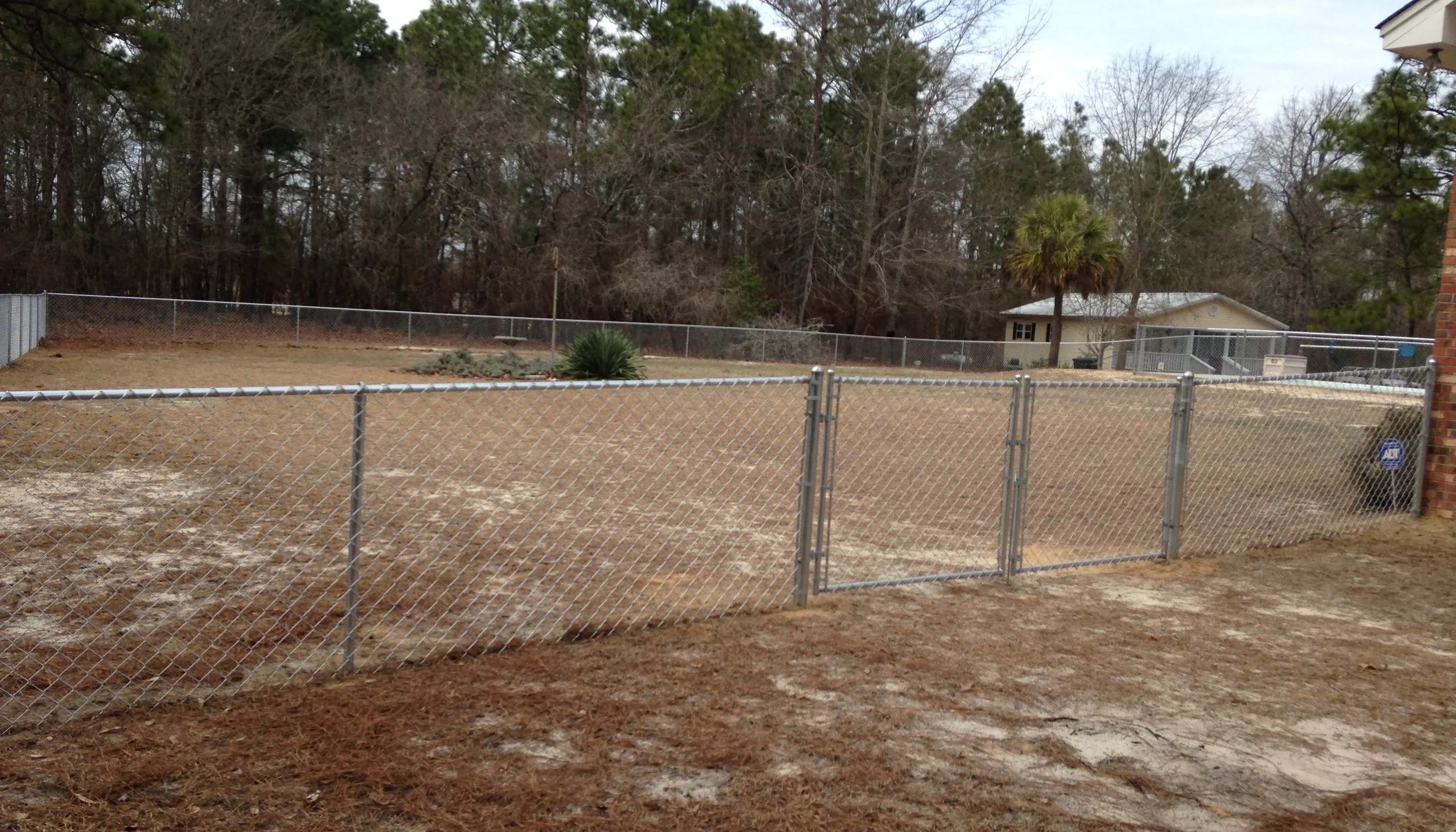 Chain-link fence surrounding a yard with dry grass, trees, and a house in the background.