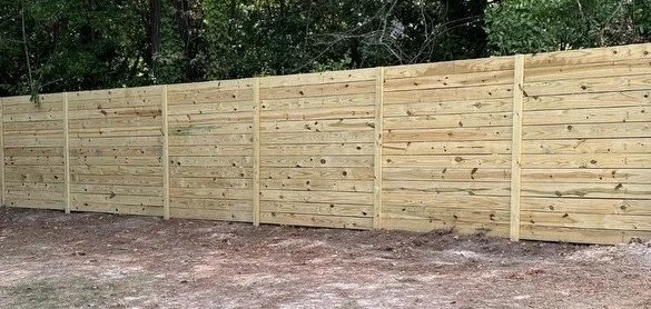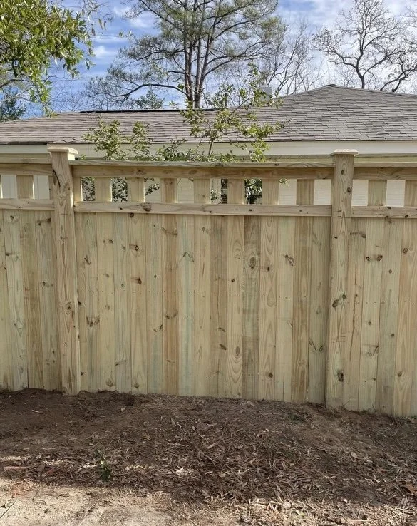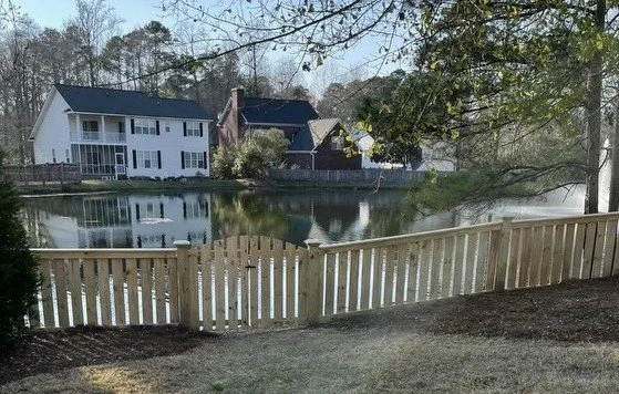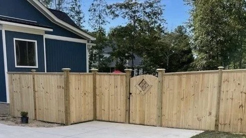 Wooden fence with a square decorative plaque in front of a blue house, surrounded by trees and a clear sky.