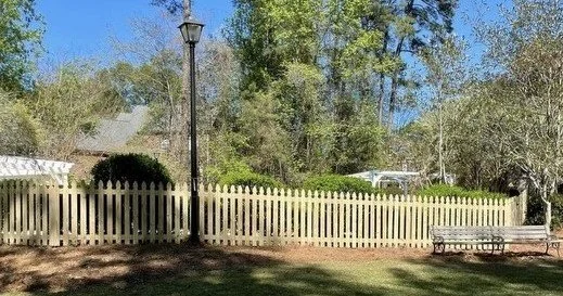 White picket fence with lamppost and bench in a park-like setting, surrounded by trees and grass.