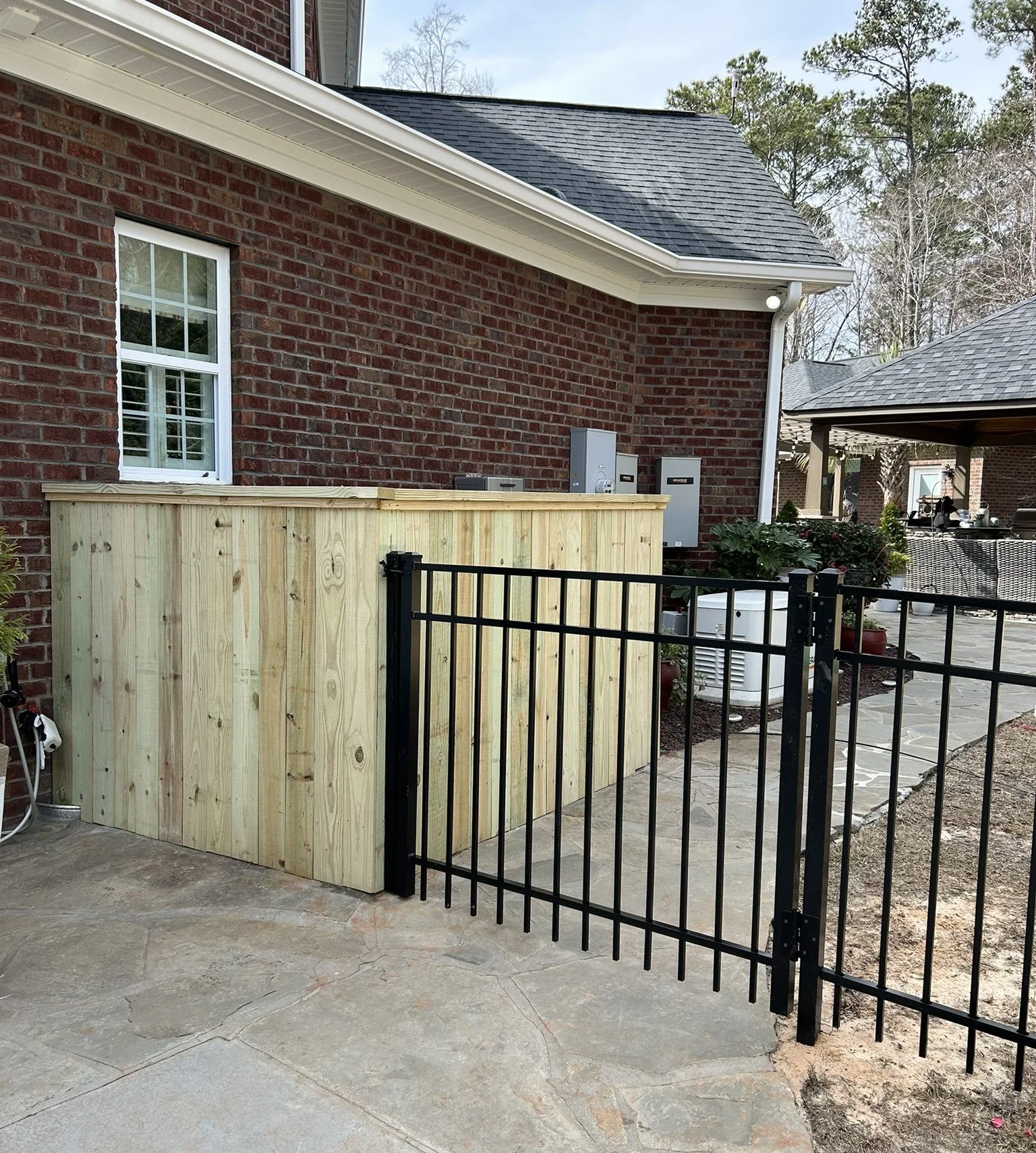 Outdoor utility enclosure with wood paneling near a brick house, adjacent to a black metal fence gate.