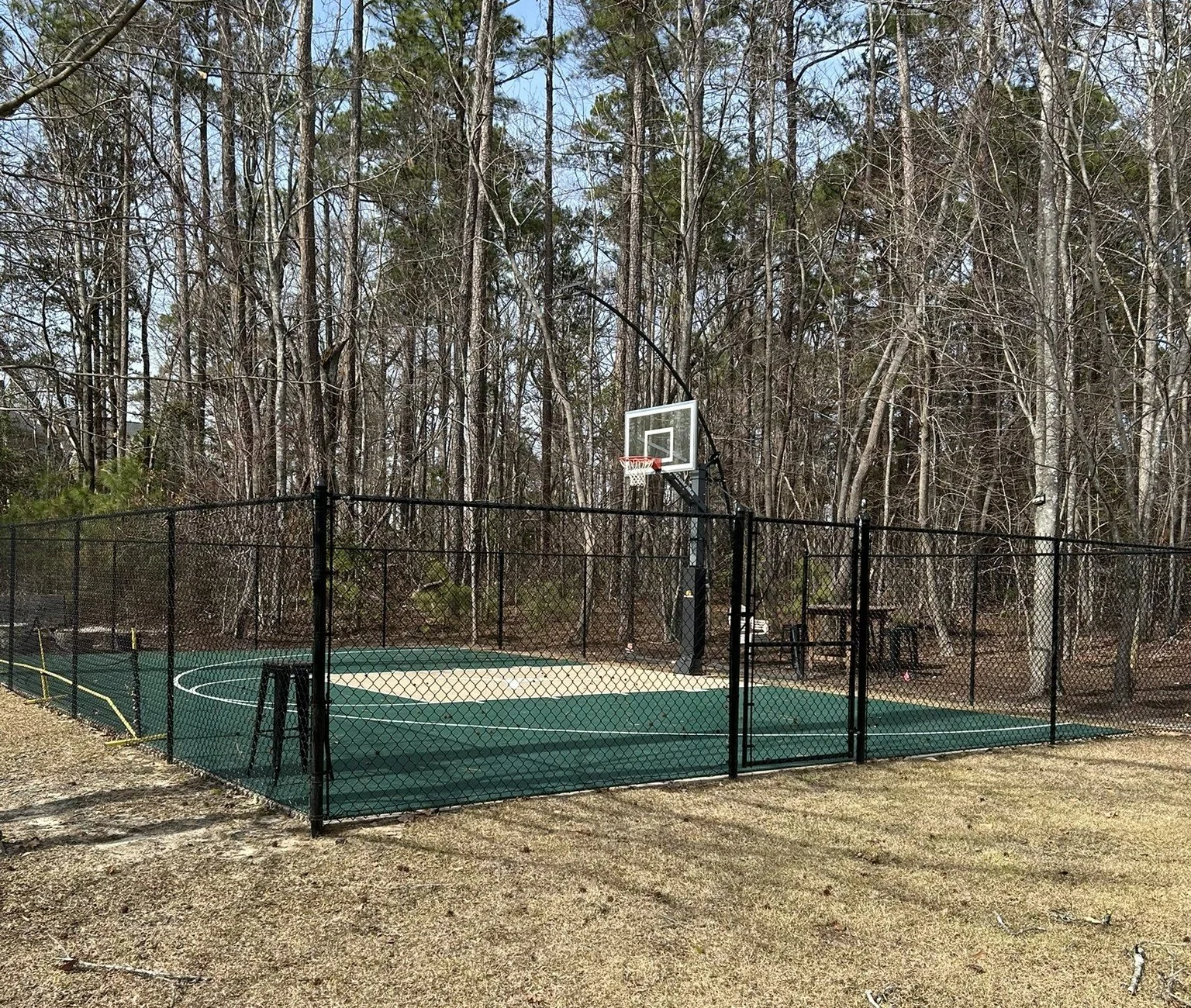 Outdoor basketball court with green surface, surrounded by a black chain-link fence, situated next to a wooded area with trees.